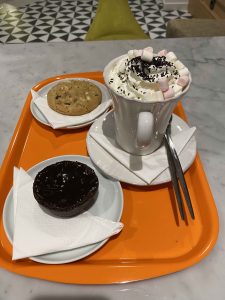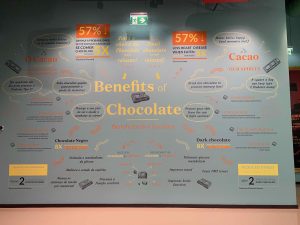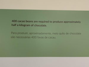 In the Chocolate Story, there was a section that focused on the harvesting of cacao and the room had cacao trees that you could touch, sounds of birds that exist in this ecosystem played, and the ground even resembled the forest floor. There was another area of this exhibit where you could smell different types of cacao beans. Toward the end of this exhibit, there was a staff member who provided the guests with chocolate samples. There were also people at work making chocolate and you could watch that happen in real-time.